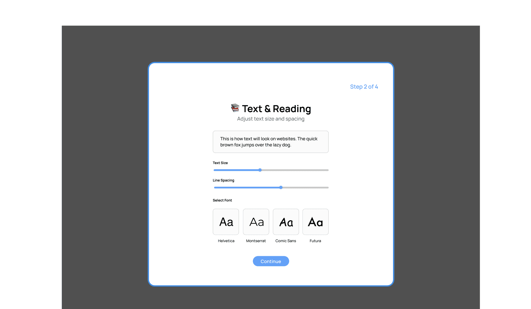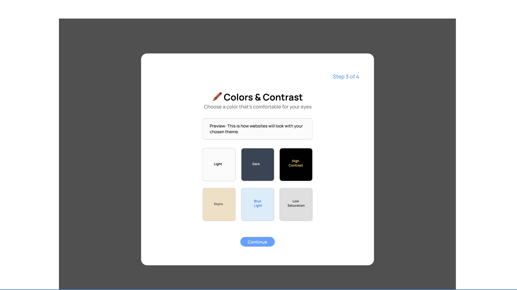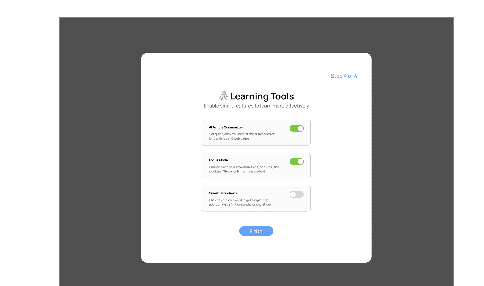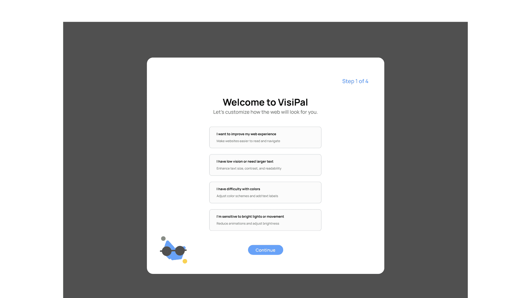 The onboarding flow helps each user personalize VisiPal to their specific visual needs in four simple steps. It begins by asking what kind of support they’re looking for—whether that’s larger text, better contrast, reduced brightness, or an overall easier reading experience. Next, users adjust text settings like font size, spacing, and type to match their comfort level. They then choose a color and contrast theme, previewing how websites will look with options like Dark, High Contrast, Sepia, or Low Saturation. Finally, users can enable smart learning tools such as AI summaries, Focus Mode, and click-to-define features to make reading and comprehension easier. By the end of onboarding, VisiPal is fully customized to each child’s unique needs, ensuring a more accessible and supportive web experience.