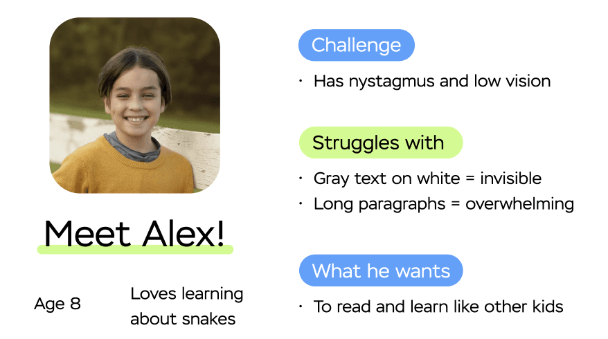 Alex is an energetic 8-year-old who’s endlessly curious—especially about snakes, animals, and anything he can read about online. But because he has nystagmus and low vision, the digital world isn’t always built for him. Subtle gray text disappears, long paragraphs blur together, and scrolling through dense pages quickly becomes exhausting.