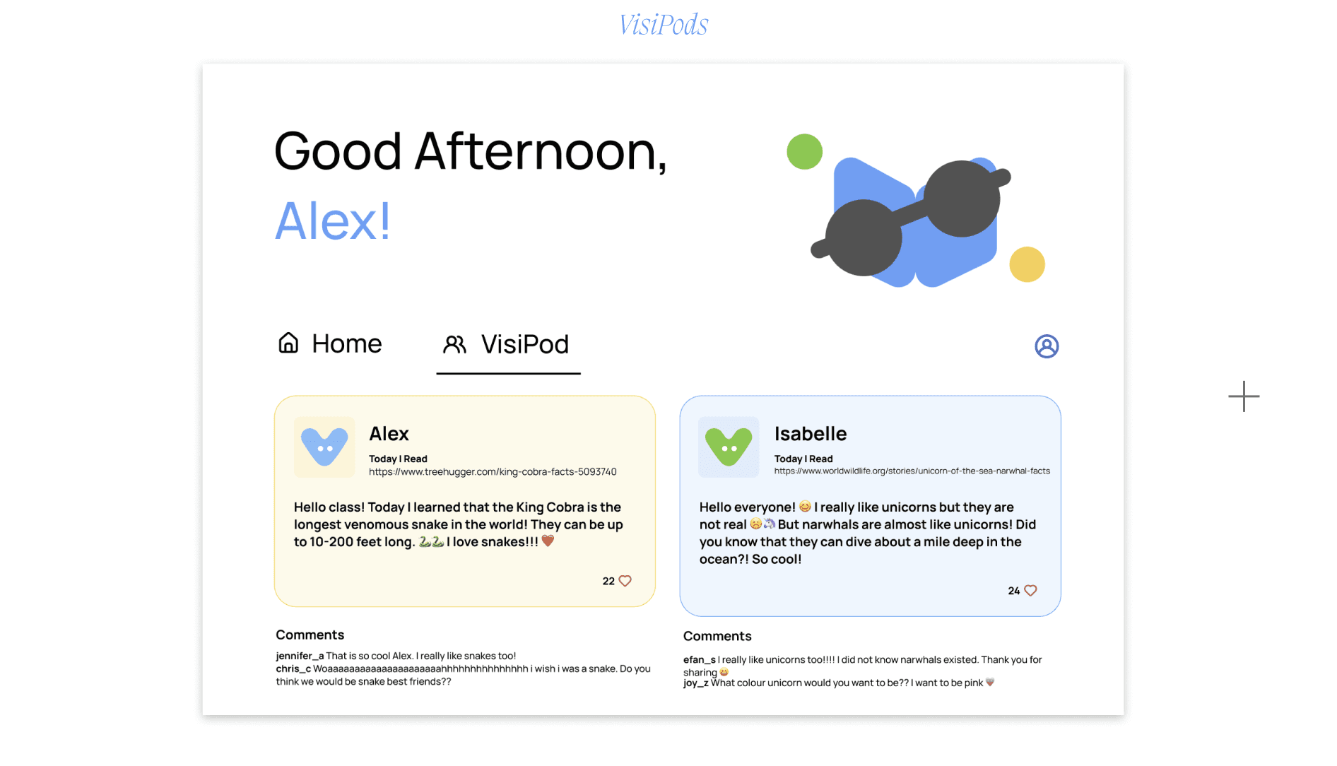 VisiPods is a shared learning hub where students can post what they’re discovering, celebrate their curiosity, and feel empowered by seeing how much they’re learning. It creates a supportive space where kids can explore together and take pride in the knowledge they’re gaining.